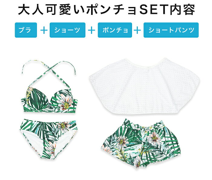 水着 レディース 体型カバー ビキニ 4点セット オトナ女子 ショートパンツ レース ポンチョ セパレート ママ水着 ホワイト ボタニカル 柄 ワイヤー入り パッド入り水着 通販