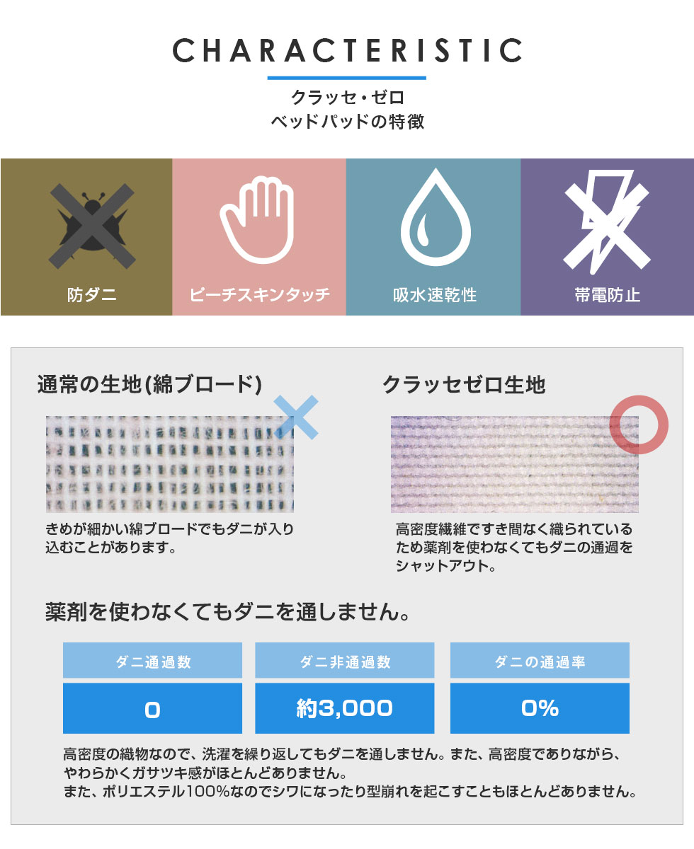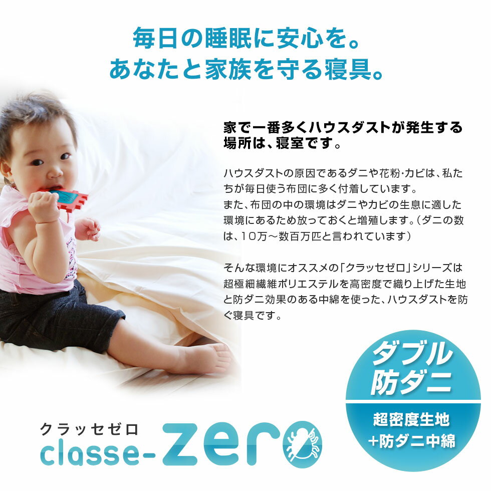そんな環境にお勧めの「クラッセゼロ」シリーズは、超極細繊維ポリエステルを高密度で練り上げた生地と防ダニ効果のある中綿を使った、ハウスダストを防ぐ寝具です。