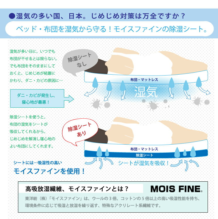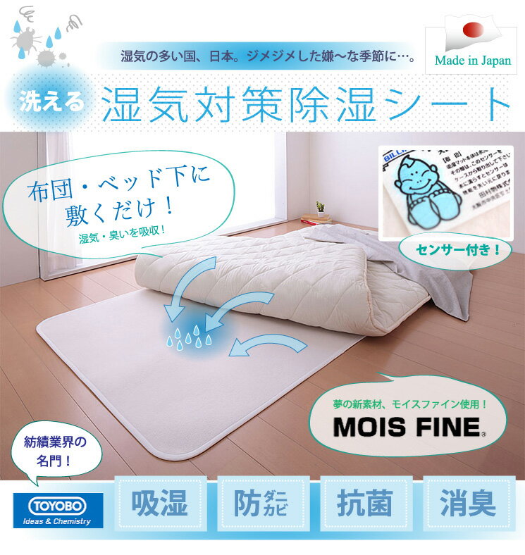【丸洗いOK】 東洋紡モイスファイン採用 センサー付き除湿マット (シングルサイズ)サイズ シングル(1枚あたり):幅90×丈180×高さ0.5cm組成 ポリエステル80% モイスファイン20%重量 0.7kg製造 日本製特長■抗菌・消臭・防カビ■丸洗いOK!洗えて清潔! 洗うことにより汗などの分泌物を除去して清潔にご使用いただけます。