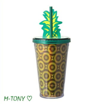 パイナップルが描かれたボディは二重構造になっていて、葉をデザインした紙のコースターがフタの上に付いているユニークなタンブラーです。